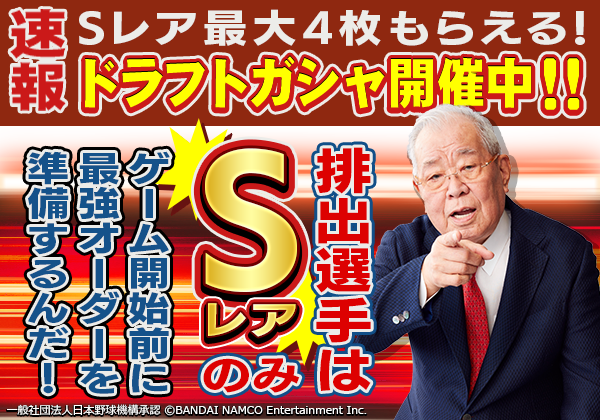 事前登録ガシャ)」を開催いたします。ゲーム配信後にプレイヤーに立ちはだかる強敵ノムラスターズに挑むため、あらかじめ強力な選手カードを入手しておこう! 「ドラフトガシャ(事前登録ガシャ)」は何度でも引き直しができ、さらに全ての選手カードを引くとボーナスも!