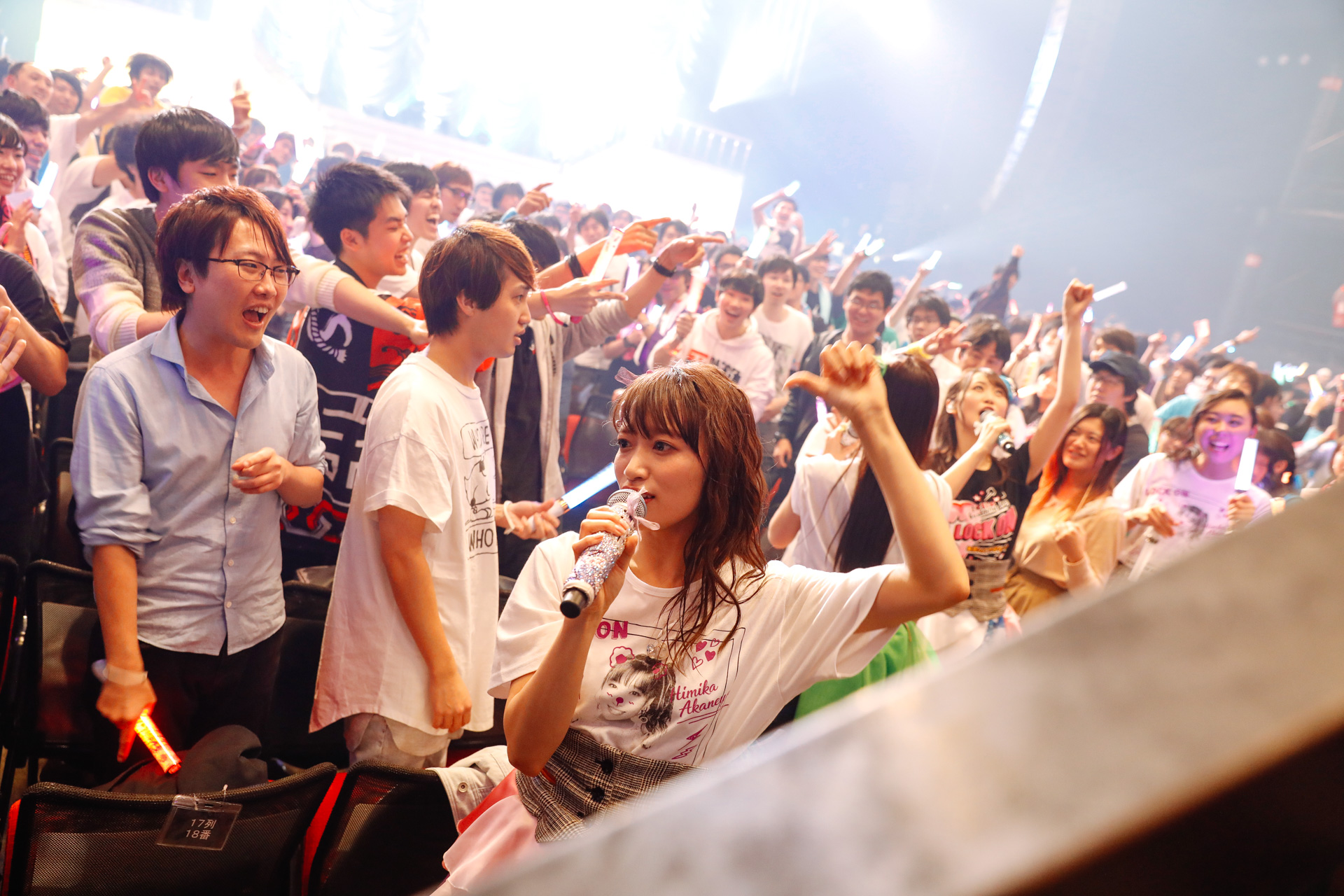 アンコール前には、メンバー同士楽屋裏でのコメントが流され、ファンとコミュニケーションをとりながらアンコールを誘導するという、一時でもお客さんを楽しませようというテイストも盛り込まれており、会場は終始声援に包まれていました。アンコールでは、メンバーがメインキャスト・主題歌を務めていたTVアニメ「プリパラ」の人気曲、「Make it!」で始まり、メンバーは舞台ではなく客席を横断、お客さんと一緒に盛り上がるサプライズ演出を行い会場はさらに熱気に包まれました。また、ライブでは初披露、そして会場一体となってダンスをした「アメコイ」で、さらに温度を上げますが、MCで「アメコイの曲のリハーサル後はいつも雨だった」というエピソードも披露。