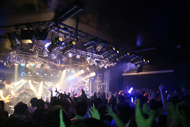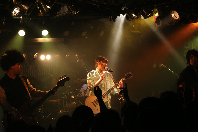 今回のツアーのカラーともなっている蒼い照明の中登場し“シロゾウ”こと相方のエレキギターをかき鳴らしながら「Moment」からライブの幕を開けた。曲中のサビの部分で首を傾げる場面がとてもキュートでテンションの上がる楽曲で1曲目から会場の熱は一気に加速。デビュー曲「CHOIR JAIL」のイントロが流れると歓声が沸きあがり楽曲の不思議な世界観に引き込まれてゆく。