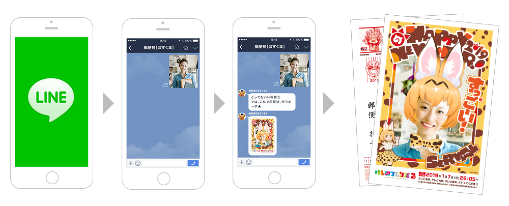 LINEだけで年賀状のデザインから、印刷、配送までが完結するサービスです。