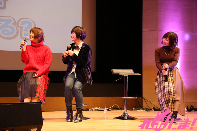 続いては「私の推しシーンは? チーム対抗 ジェスチャークイズ」。さとちゃんラブチーム(久野さん、洲崎さん)、しおちゃんラブチーム(花澤さん、花守さん、花江さん)に分かれ、作中に登場したシーンをお題にジェスチャーで対決。花澤さんのジェスチャーで久野さんが正解するなど、仲の良さを見せつけるなか、花江さんのジェスチャーのクオリティの高さで「しおちゃんラブチーム」が優勝。作品にたびたび登場するお菓子「こんぺいとう」1kgが賞品として贈られた。