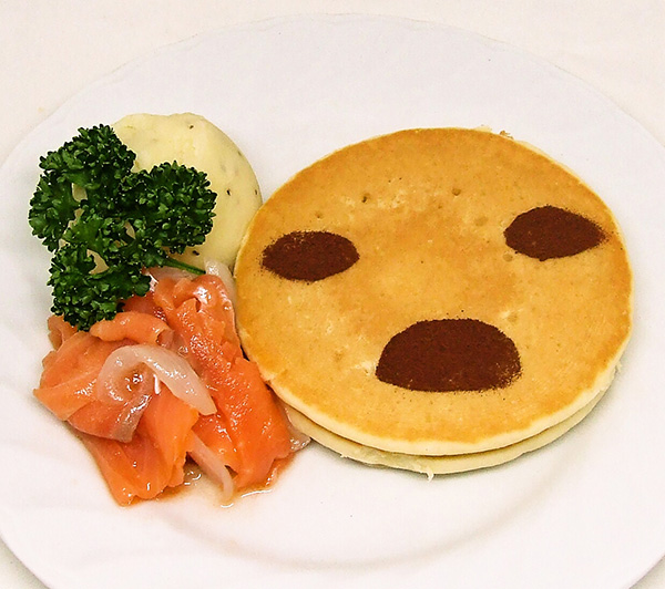 玉葱とサーモンをイタリアンドレッシングで和えたマリネにマッシュポテトのまろやかさが加わったお食事系パンケーキ。