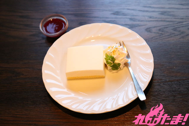 呪い除けの籠のような正方形のレアチーズケーキ。リコをイメージした黄色と黄緑のアラザンがかかったホイップも。