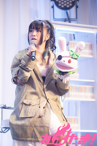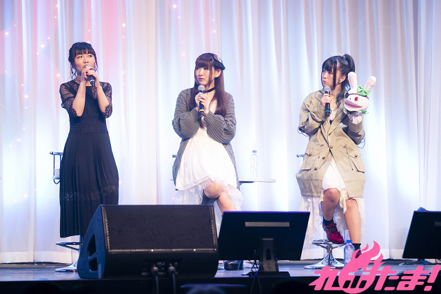 トークパートには時崎 狂三役・真田アサミさん、鳶一 折紙役・富樫美鈴さん、四糸乃役・野水伊織さんが登壇。野水さんはウサギのパペットを手に登場。『無敵王トライゼノン』にも出演していたという、富士見ファンタジア文庫に縁のある真田さんは、狂三を演じるうえで「どんなセリフでもニュートラルさを意識してほしい」と言われたそう。そして富樫さんは主人公の五河士道について「八方美人」と表現。ほかのふたりからも辛らつなコメントが(笑)。