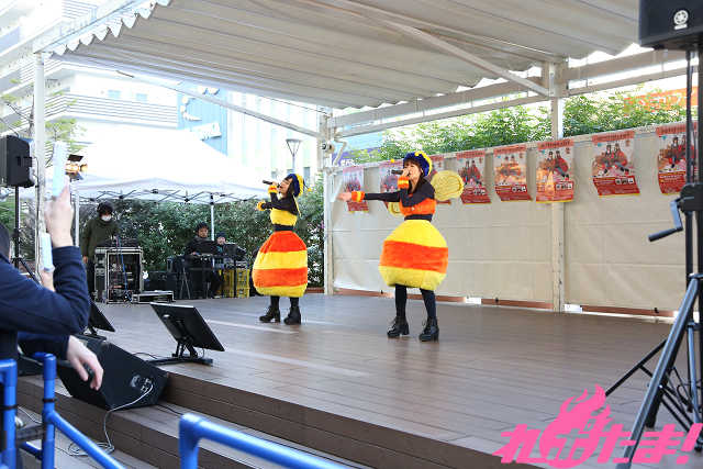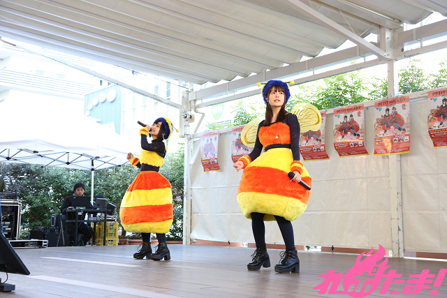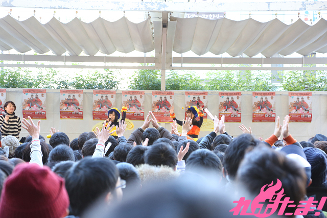「1曲歌ったら暖かくなった!」とふたりにエンジンがかかってきたところでイベント前半で練習した「Howling」を披露、ムッチュ☆のテンションも最高潮!「男子!」「女子!」「全員!」とコールに対し、「オイ!オイ!」というレスポンスが会場に鳴り響いた。通りがかりのちびっこの中にも、ふたりのことを知っている子がいたりと、関西初の歌唱イベントは、たくさんの“はじめまして”を生む最高の環境の中でのパフォーマンスとなった。