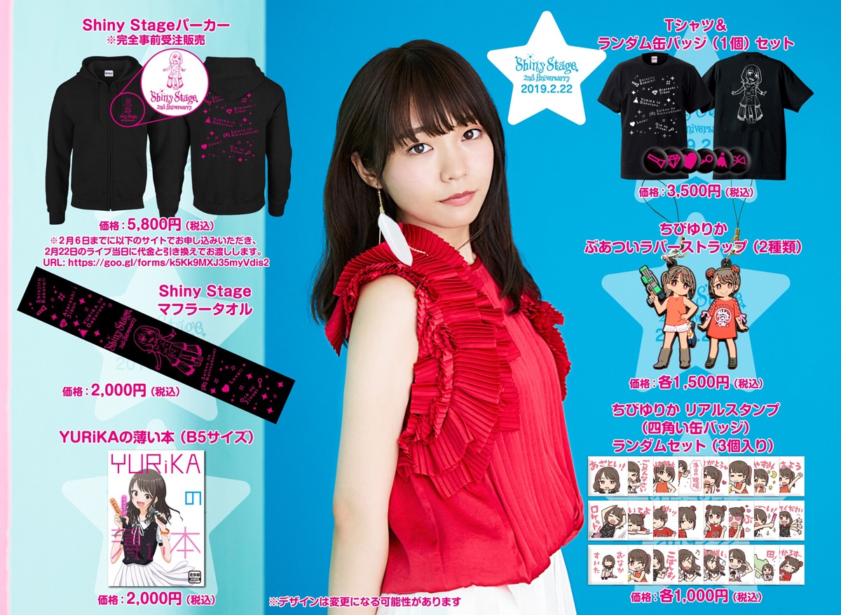 このライブ会場にて発売開始となるYURiKAグッズには、このスタンプの「ちびゆりか」がデザインされたグッズが各種発売になります。「Shiny Stageパーカー」はWEBでの完全事前受注販売。2月6日(水)23:59でまでが受付期限となっています。以下のサイトよりお申し込みください。