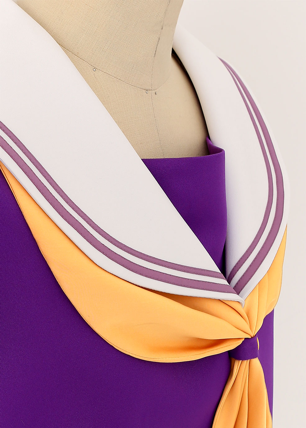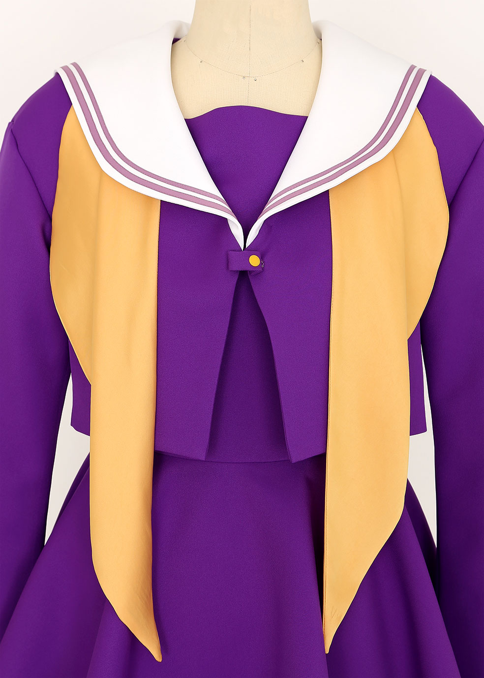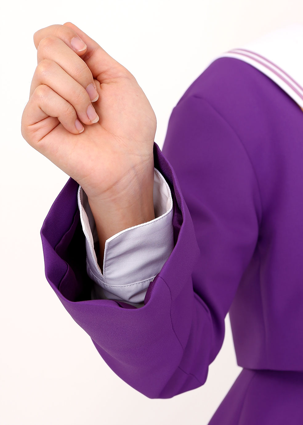 印象的な紫色と黄色いスカーフのアクセントが可愛いセーラー服は、オフィシャル監修の元こだわって選び抜いた生地を使用。作品の世界観を表現した鮮やかな発色と着心地の良さを兼ね備え、天才美少女「白」にふさわしい上質なセーラー服に仕立てました。