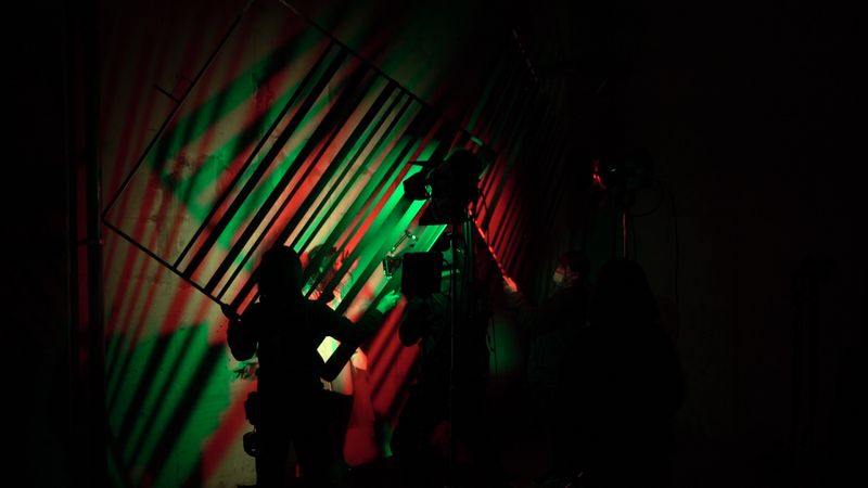 赤と緑の光の線が交錯するシーンで、スタッフお手製の、赤と緑のフィルムを縦に貼った撮影キットを駆使して撮影。フレームの影が映り込んでしまって、撮り直すということも。