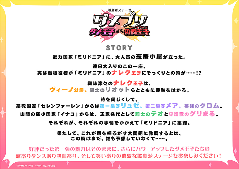 好評だった第一弾の魅力はそのままに、さらにパワーアップしたダメ王子たちの歌ありダンスあり殺陣あり、そして笑いありの過激な歌劇派ステージをお楽しみください!