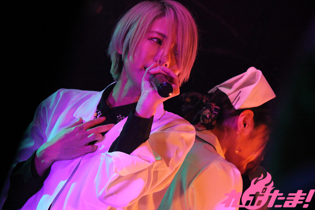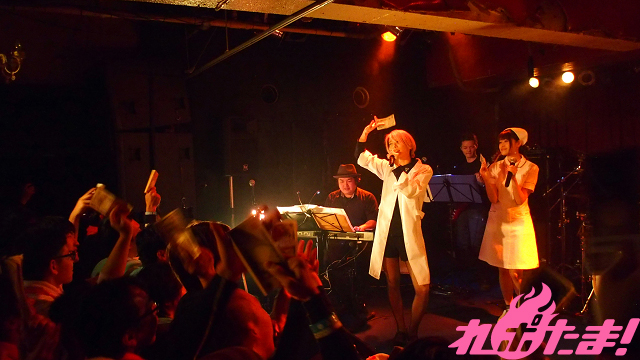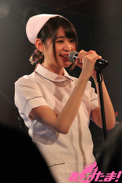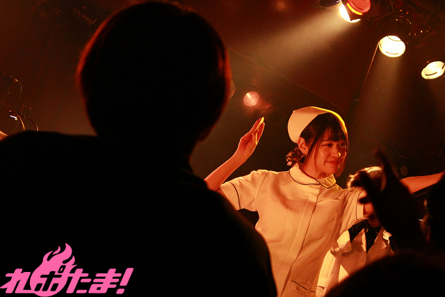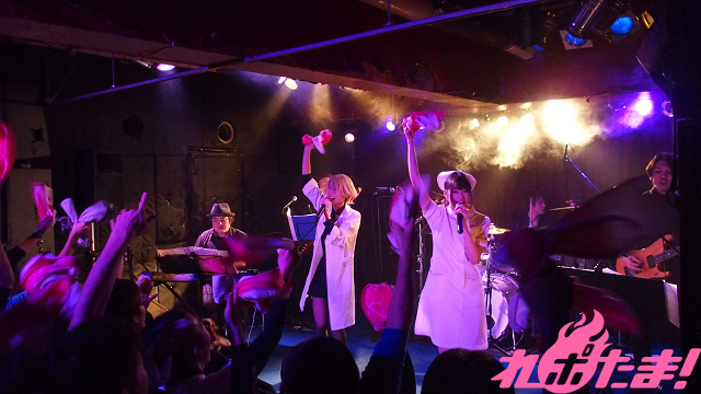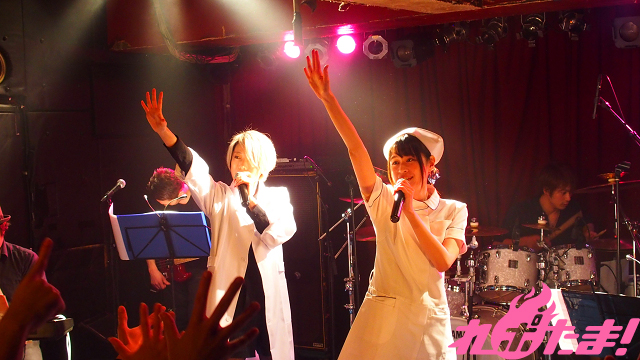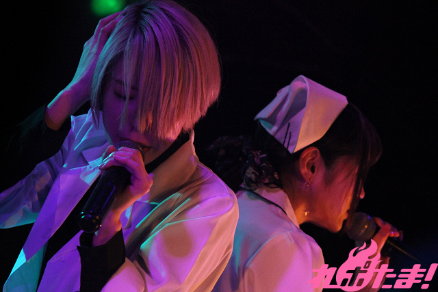 道井さんが医者、森さんが看護師といつものコスチュームに身を包み、ステージに登場すると、まずは、あいさつがわりに昨年発売のミニアルバム『ナゼナラバ』から「OIL KING♡」を披露。「ライオン100匹欲しいの」(道井さん)、「109に住みたい」(森さん)とふたりのおねだりにオーディエンスが「プレゼントしてあげる!」と応える、独特のコール&レスポンスで楽しんだ。