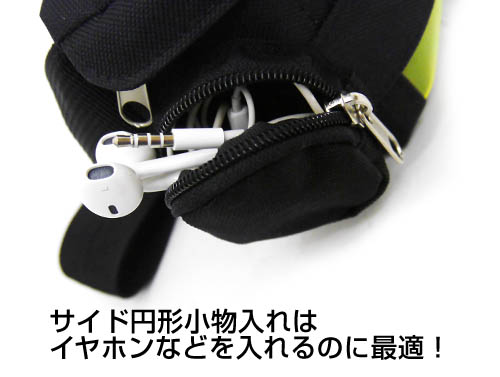 ・サイドにはイヤホンなどの収納もできる小物入れ付き。