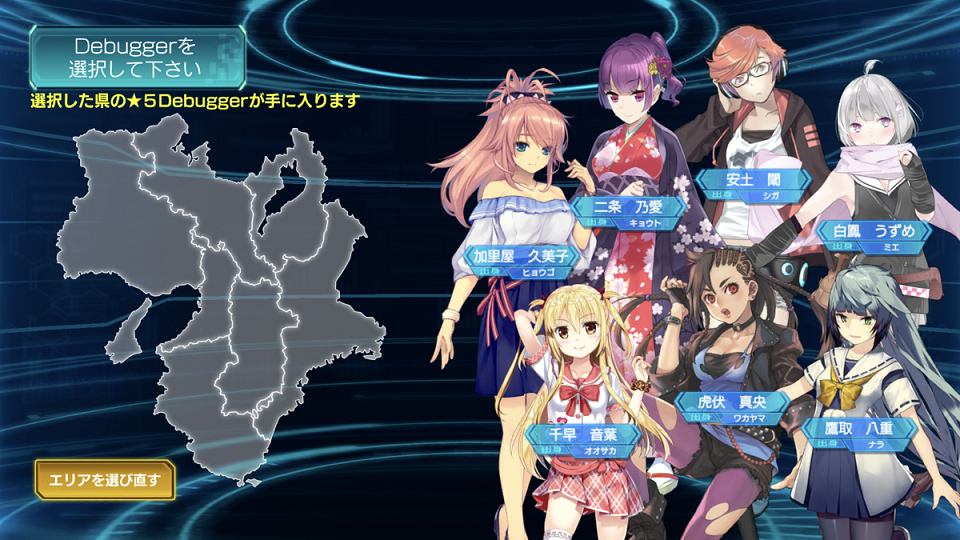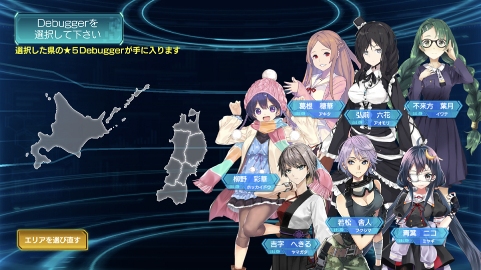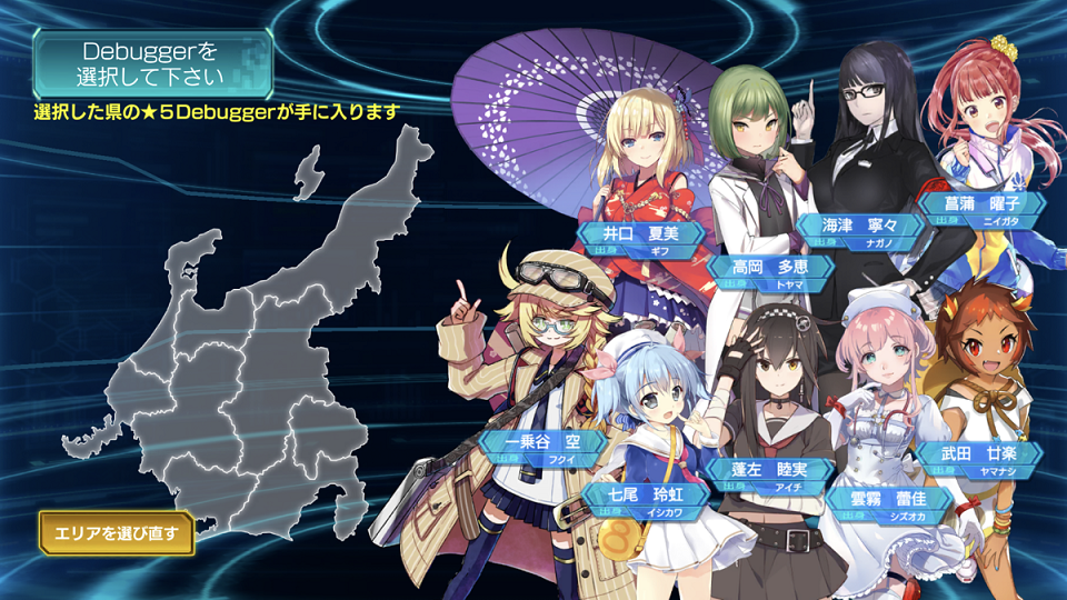 47都道府県それぞれを出身地とする47人の中からお好きなヒロインを1人選択してゲームを開始できます。選んだヒロインは最高レアリティ(※1)である★5です。自分の出身地や、好みのキャラクターと共に戦いましょう。