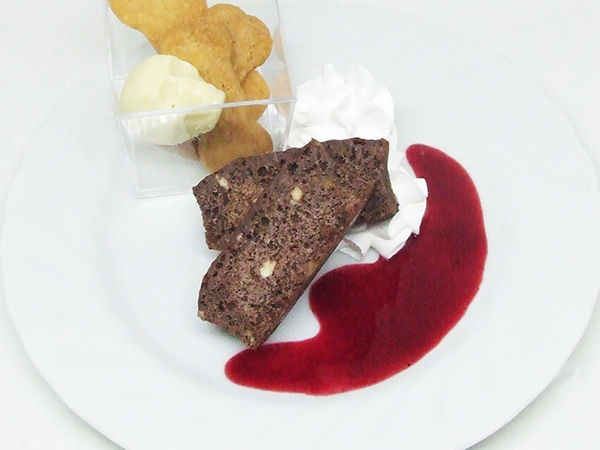 血をイメージした酸味の強いフランボワーズソースは濃厚なブラウニーと相性が良く、ボリュームも満点!