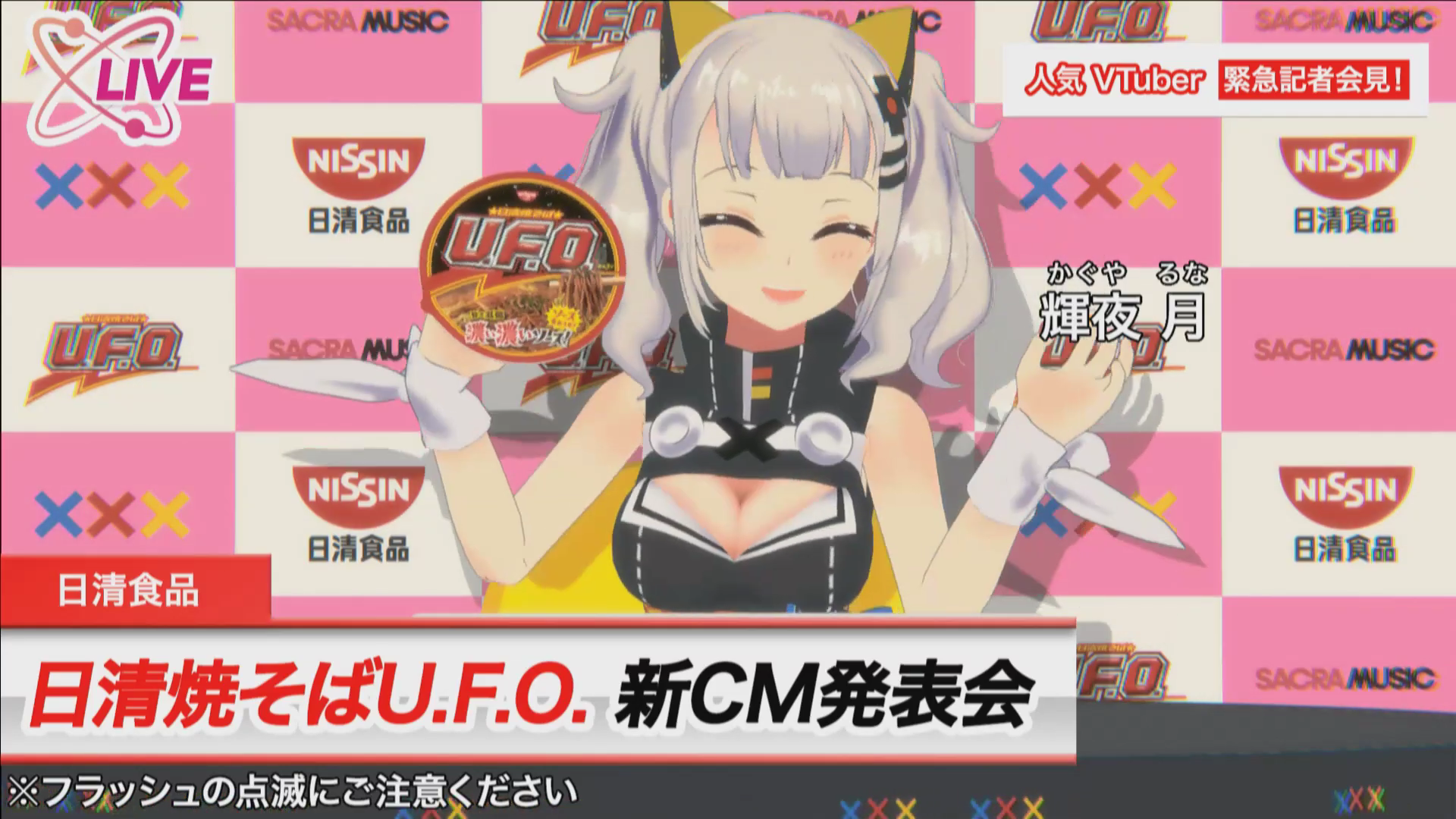 そんな輝夜 月が「日清焼そばU.F.O.」でTV CF初出演する事が、本日正午に行われた業界初バーチャル生CM発表会で解禁された。バーチャル生記者会見ではCM音楽コラボを行った大人気バンド「マキシマム ザ ホルモン」メンバー全員が乱入し、楽しい会見となった。このCF初オンエアは今晩3月14日(木)の「アメトーーク!」のCM枠でとなる。ブッ飛んだCFになっているとの事なので、是非、チェックして欲しい。そして「輝夜 月」キャラクターデザイナー、Mika Pikazoさん書下ろしの「日清焼そばU.F.O.」ポスターも本日公開された。