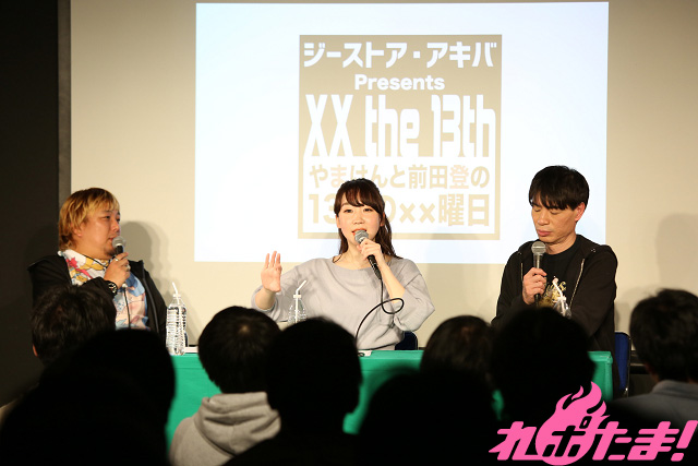 株式会社TRYALL社長&インターネットラジオステーション<音泉>創業者であるやまけんさんと、よしもとのお笑いコンビ「はりけ~んず」のボケ担当でアニメ大好き芸人として有名な前田登さんが、女性声優やアニソン歌手といったゲストを迎えて熱く楽しく盛り上がるアニメ・声優トークイベント『13日の××曜日』。