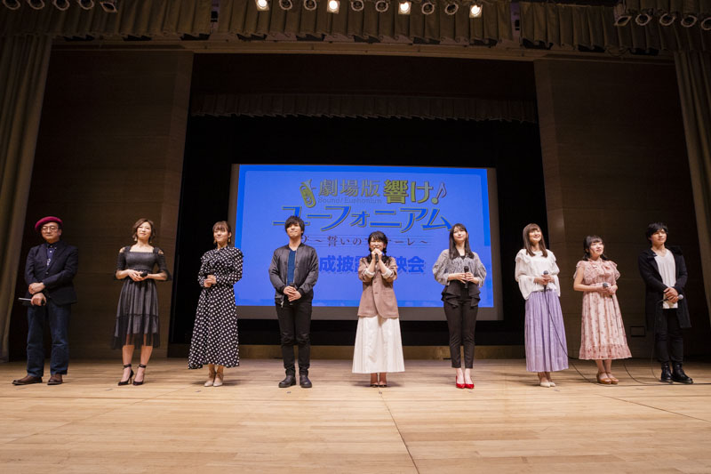 上映前の舞台挨拶では、黄前久美子役の黒沢ともよ、加藤葉月役の朝井彩加、高坂麗奈役の安済知佳、塚本秀一役の石谷春貴、石原立也監督に加え、新1年生キャストとなる久石奏役の雨宮天、鈴木美玲役の七瀬彩夏、鈴木さつき役の久野美咲、月永求役の土屋神葉が登場し、劇場公開を間近に控え、本作の見所や作品への想いを語った。
