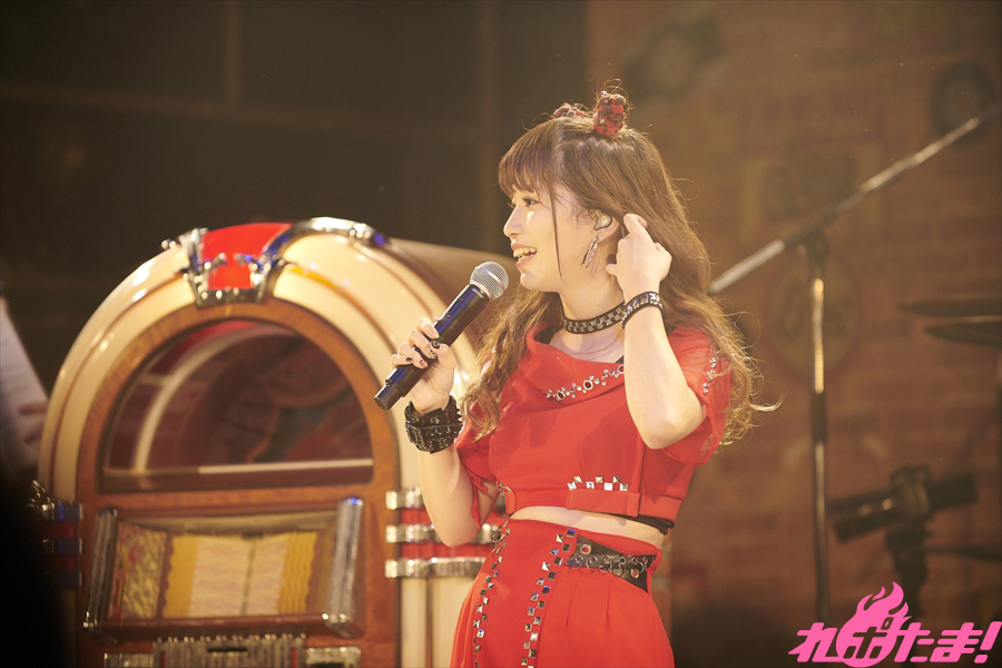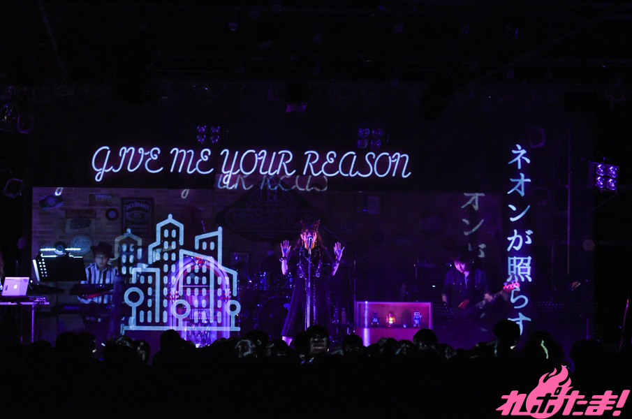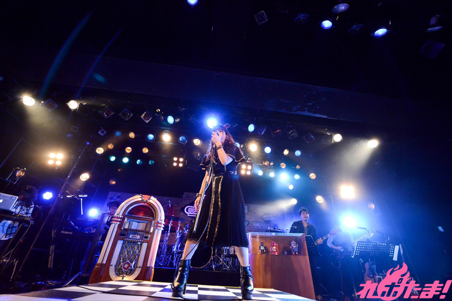 紗幕がおりるとジュークボックスを背に「KILL ME One More Time?」、「Play the game」、そしてスタンドマイクをたくみに操りデビュー曲であるテレビアニメ『Occultic;Nine -オカルティック・ナイン』EDテーマ「Open your eyes」と歌唱した。
