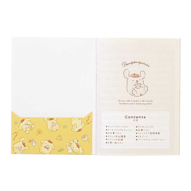 記念日を忘れずにお祝いするための「アニバーサリーリスト」、応援しているアイドルの情報を記入する「アーティストプロフィール」、逃したくないテレビ出演や雑誌の発売などをメモする「お仕事リスト」、チケットの申し込み期間や当選結果などを管理できる「チケット申し込み履歴」、グッズの購入を記録する「お買い物リスト」、贈り物の記録をする「プレゼントリスト」、会場の場所やキャパシティを記録できる「会場リスト」、忘れがちなファンクラブの更新日や会員番号をメモできる「ファンクラブ登録情報リスト」など、たくさんの内容を書き込める仕様です。