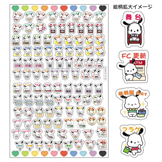 また、クリアファイルホルダー、会報ファイル、チケットホルダー、記録ノートには、アイドルファンの必須アイテム(チケット、ブロマイド、うちわ、ペンライト、ファンレター、銀テープなど)のイラストが描かれ、サンリオキャラクター自身がアイドルのファンになったかのようで、思わず共感したくなるデザインが特長です。