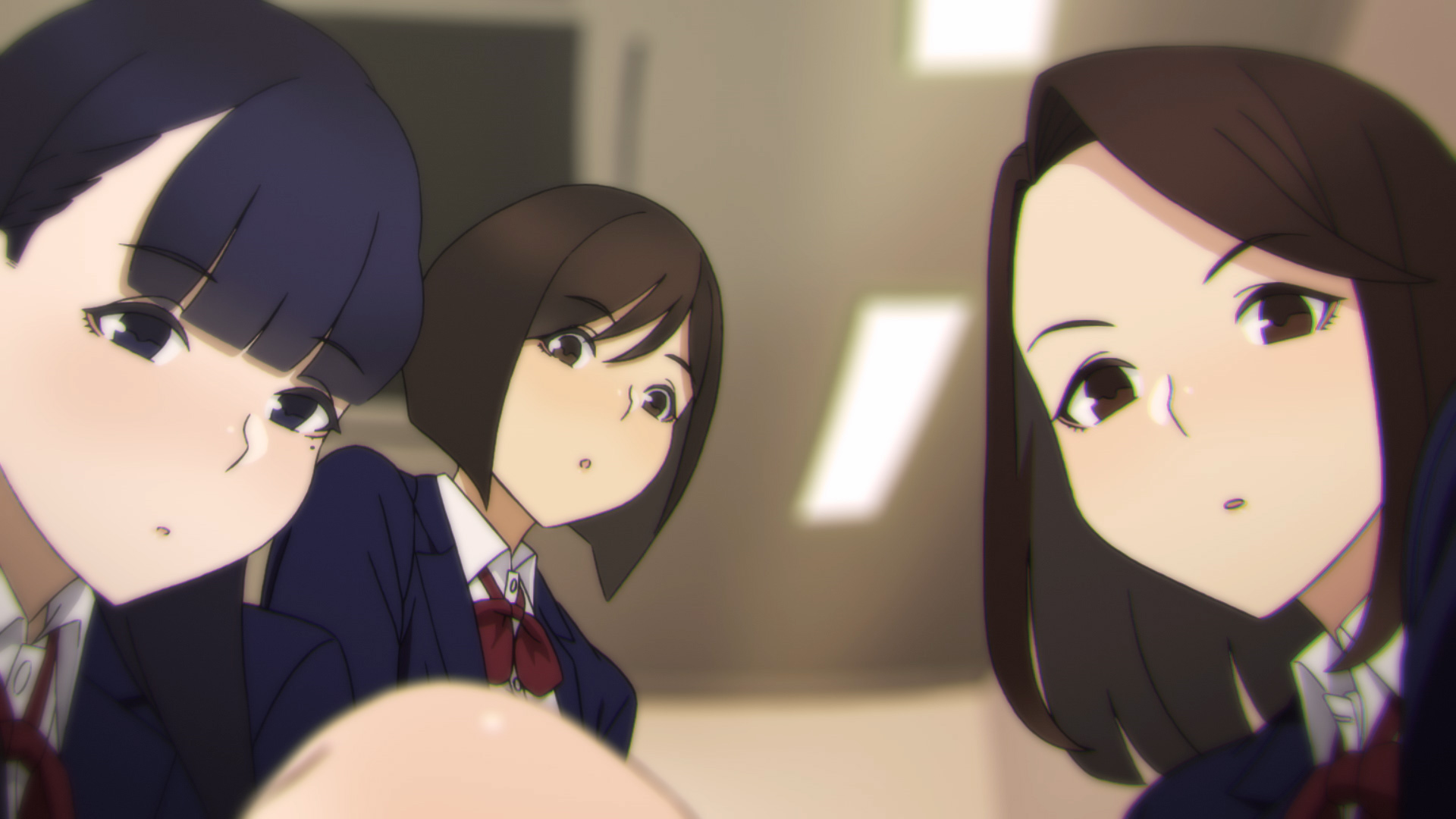 「おはよ、レン」。下駄箱の前で、濡れたタイツのレンにユアが話しかける。憂鬱そうに振り向くレンに、そこにいっそうびしょ濡れのホミが、跳ねるようにやってきて話に花を咲かせる。他愛無い3人の女子生徒の会話が、新学期の訪れを教室に告げる。