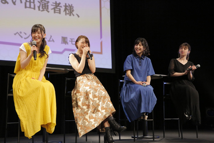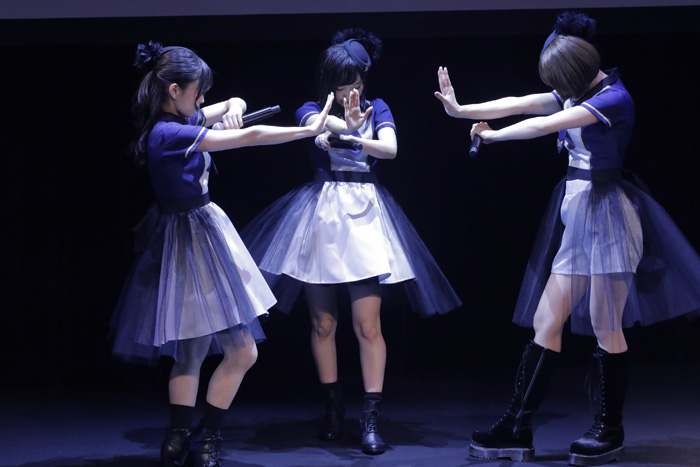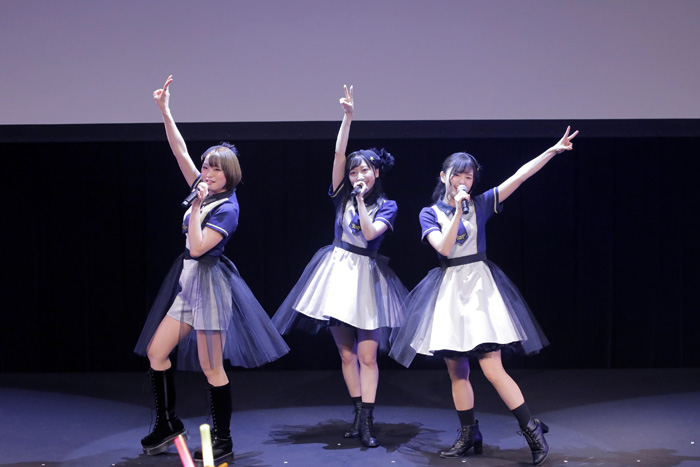 ミニライブのコーナーでは、まずOP主題歌を担当した声優ユニット「Run Girls, Run!」(林鼓子・森嶋優花・厚木那奈美)が登場。2018年の電書祭から歌い続けてきた「Break the Blue!!」を披露し、激しいダンスパフォーマンスを披露しました。