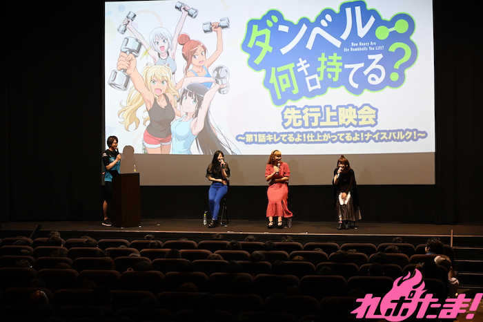 コミックアプリ「マンガワン」(小学館)にて大好評連載中、7月3日(水)よりTVアニメが放送開始となるJK肉体改造コメディ『ダンベル何キロ持てる?』の先行上映会〜第1話キレてるよ!仕上がってるよ!ナイスバルク!〜が6月21日(金)東京・EJアニメシアター新宿にて行われた。イベントにはファイルーズあい(紗倉ひびき役)、雨宮天(奏流院朱美役)、石川界人(街雄鳴造役)、石上静香(上原彩也香役)のメインキャスト4名も登壇し、作品の魅力や筋トレ体験がたっぷりと語られた。