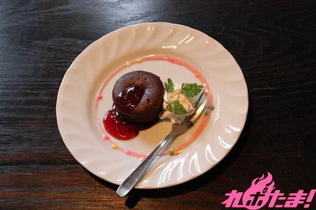 ヒロインらしく可愛くフラワーシュガーをあしらったお皿の真ん中には温かいフォンダンショコラとドロッとしたストロベリーソース。
