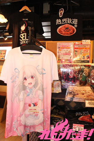 ▲店内の様子。レジ横にはグッズが並び、SNS用の小道具もご用意。コラボ期間中は「Tシャツ化」をかけた名エピソードの人気投票を実施中! 詳細は公式HPおよび来店時にチェック!