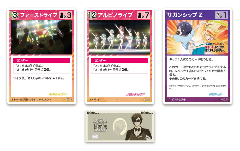 本商品は、プレイヤーがアイドルプロデューサー巽幸太郎になり、アニメ「ゾンビランドサガ」に登場するアイドルグループ「フランシュシュ」を導いてライブを成功させ、より多くのファン(= 得点)の獲得を目指すゲームです。