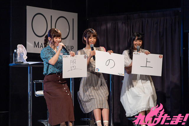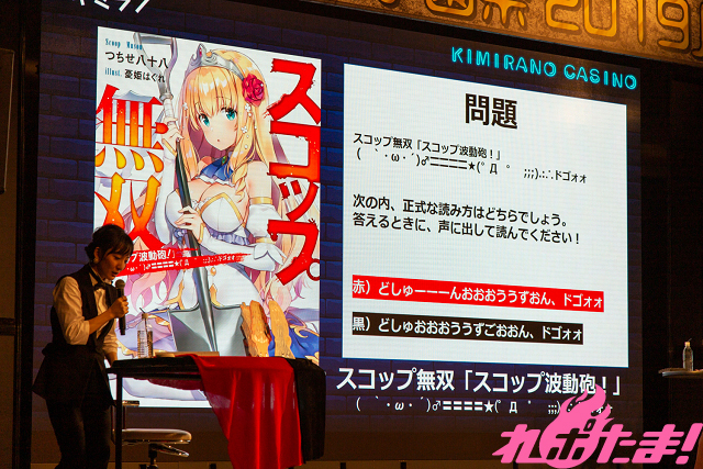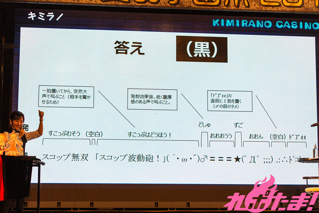 赤、黒2つの解答から正解を選ぶ「ルーレットクイズ」では、特徴的なタイトルが話題となっている『スコップ無双 「スコップ波動砲!」( `・ω・´)♂〓〓〓〓★(゜Д゜ ;;) .:∴ドゴォォ』の顔文字部分の正しい読み方はどっち?という問題が出題され、3人は思い思いの感情を込めた熱い解答を披露し会場からは歓声が上がっていた。