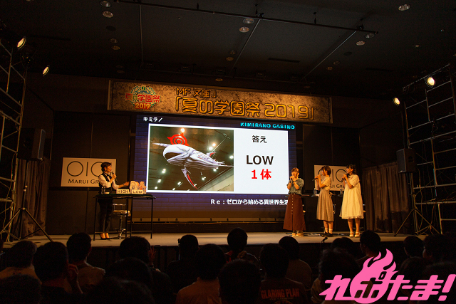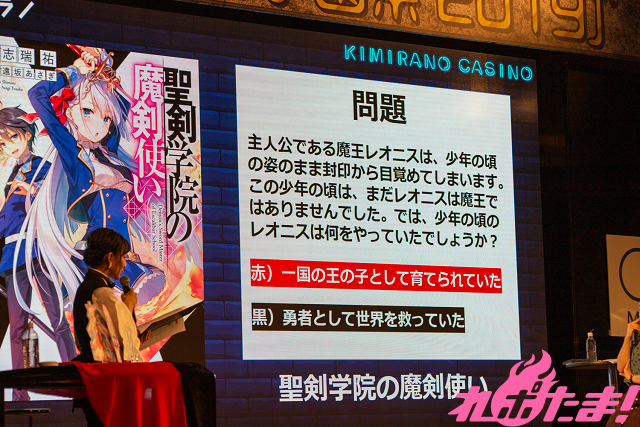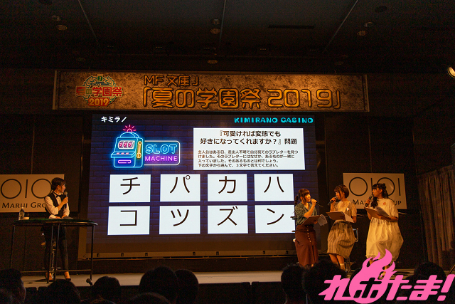 最終ゲームでは高級焼き肉お食事券を賭け、「ラノベキャラ当てクイズ」と題したパネルクイズに挑戦。このコーナーはこれまで貯めたチップの分だけパネルをめくることが出来、後ろに隠されているMF文庫Jを代表するラノベのタイトルとキャラクターを当てるというもの。順調に正解を積み重ねチップを貯めていた3人は難なく答えを導き出すと、最後は会場も一体となり「ゼロの使い魔のルイズ」と解答し、見事に高級焼き肉お食事券をゲットしていた。