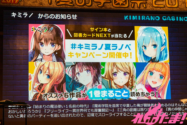 7月28日(日)、東京・ベルサール秋葉原にて開催された「MF文庫J『夏の学園祭2019』」にて『キミラノ』スペシャルステージが行われ、パートナーキャラクターを演じる野村香菜子(綴野つむぎ役)、河野ひより(ノエル・ミルフォード役)、指出毬亜(猫屋敷華恋役)、司会の松澤千晶が登壇。「キミラノクエスト~ラノベカジノへようこそ~」と題して、MF文庫Jのライトノベルをお題に様々なゲームが行われた。