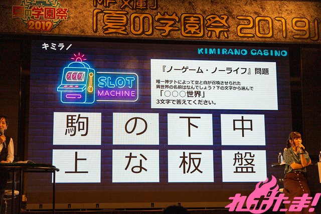 最初の「スロットクイズ」は、画面に映される8文字の中から1人1文字を選び回答となる3文字を作るチーム戦。『ノーゲーム・ノーライフ』の主人公である空と白が召喚された異世界の名前は?という問題では、全くピンと来ていない様子の3人が観客からのヒントを解読しようと一生懸命な姿を見せ笑いを誘っていた。