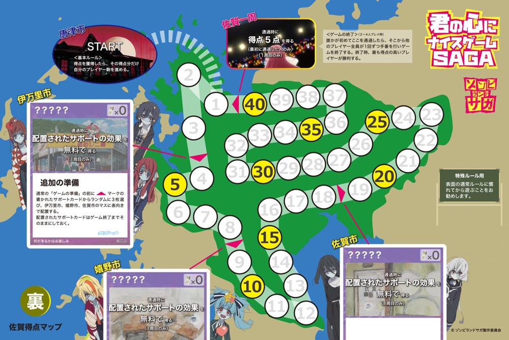 そして遂に本日8月9日からの発売ということで、キャラクターカードのゾンビ姿と、遊び慣れたら遊んでほしい佐賀得点MAPの裏面を公開!「ゾンビランドサガ~君の心にナイスゲームSAGA~」は佐賀店拠点、amazon、ゲーマーズ全店(※オンラインショップを含む)、全国のボードゲームSHOP等で販売開始です!