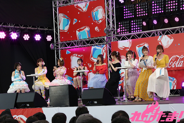 当日は吹き抜け状のオープンステージにて花園ゆりね役・大森日雅、ぺこら役・小坂井祐莉絵、ミノス役・小見川千明、ぽぽろん役・佐々木李子、橘芽依役・原奈津子、遊佐役・荒浪和沙、浩二(氷ちゃん)役・寺田御子、ぴの役・山田麻莉奈、そして邪神ちゃん公式レポーターの長谷川玲奈が登壇し、バラエティコーナーやミニライブで楽しんだ。