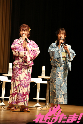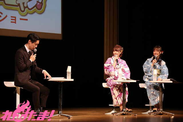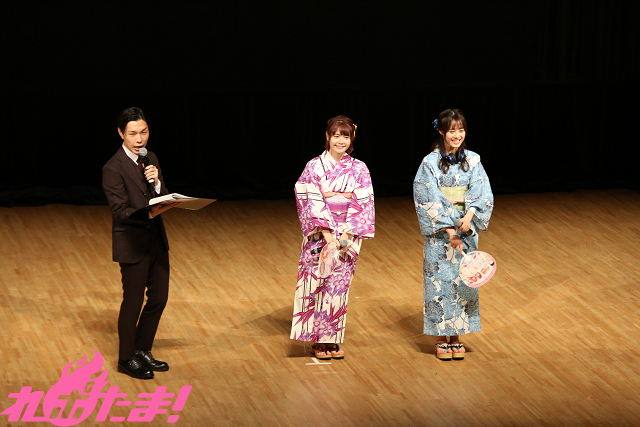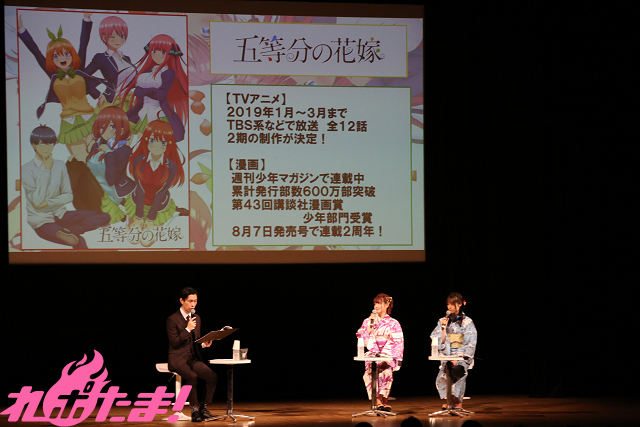 このたび番組初のイベントが開催され、進行役として岩井さん、ゲストのテレビアニメ『五等分の花嫁』中野二乃役・竹達彩奈さん、中野三玖役・伊藤美来さんが登壇した。スーツ姿の岩井さんによる番組や作品の説明が終わると、竹達さんと伊藤さんのおふたりが浴衣姿で登場。
