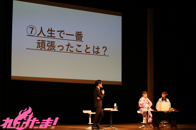 竹達さんには「人生で一番頑張ったことは?」という質問。彼女の回答は「声優になるための努力」。「14歳のときに声優の養成所に入ったので、人生の半分を声優として活動させてもらっています」