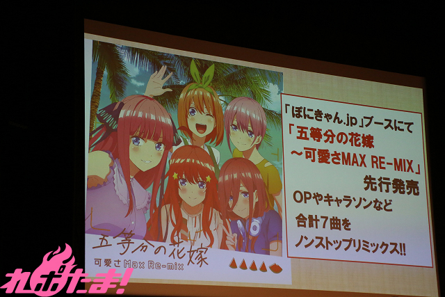 また、イベントでは8月9日~12日まで開催の「コミックマーケット96」で販売された、ノンストップメドレーアルバム『五等分の花嫁~可愛さMax Re-mix~』からニ乃と三玖の楽曲が先行で公開され、集まったファンは熱心に聞き入っていた。