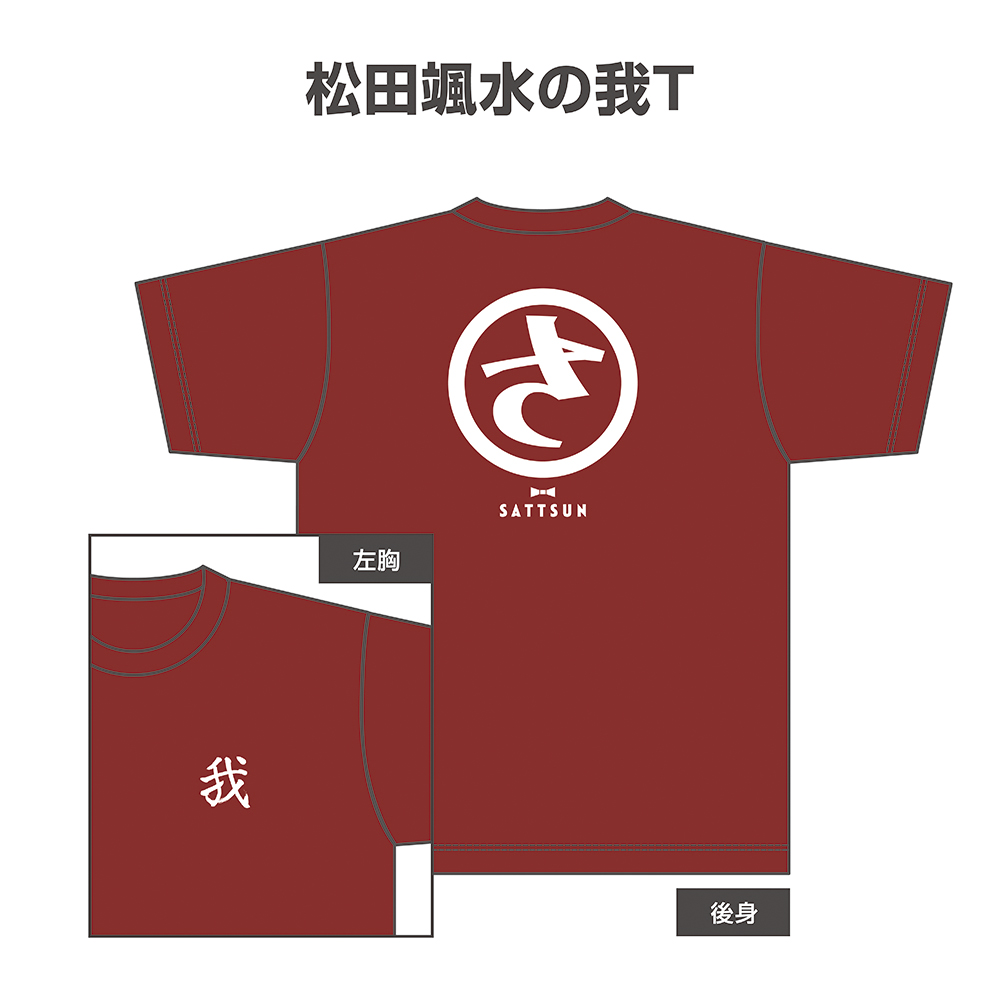 松田さん直筆の”我”の文字を胸の部分にあしらった特製Tシャツです。背面には「颯水」の”さ”の字をプリントしました。生地の色も、松田さんが好きな赤をベースに秋らしいバリエーションの配色となっております。