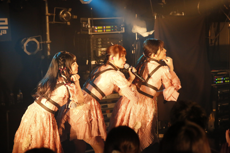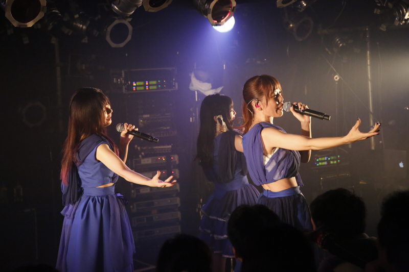 3人がロイヤルブルーのドレスで揃うと、最新シングル表題曲であるバラード「無謬の花」(TVアニメ『可愛ければ変態でも好きになってくれますか?』エンディングテーマ)をしっとりと歌い上げ、ファンはリズムを刻みながらそのやわらかな歌声に耳を傾けた。続けて3人の情熱的なハーモニーを堪能できる「kalmia」(TVアニメ『Code:Realize ~創世の姫君~』OP主題歌)、今回が初披露となるセクシーなダンスチューン「Healthy」を歌うと、MCへ。