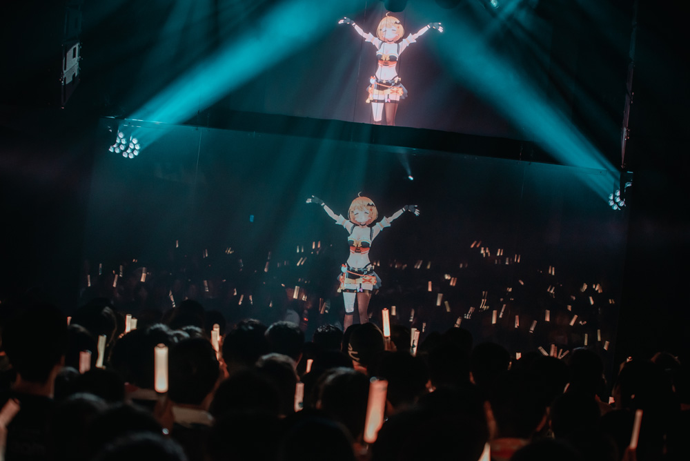 続いて登場したのは今回メインMCとして場を盛り上げたさくらみこが登場。「今回1曲目はバラードをやってみたいなと思って。」と1曲目にやなぎなぎの「ユキトキ」を披露した。普段とのギャップで会場を魅了しつつ、最後にボカロPキノシタプロデュースのオリジナル楽曲「マイネームイズエリート」で盛り上げた。