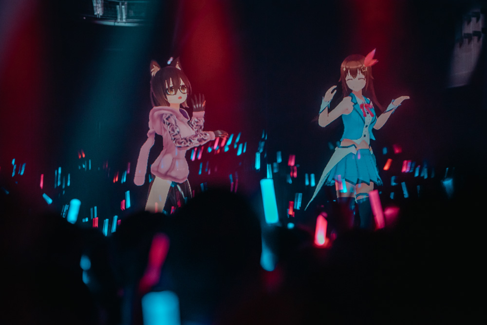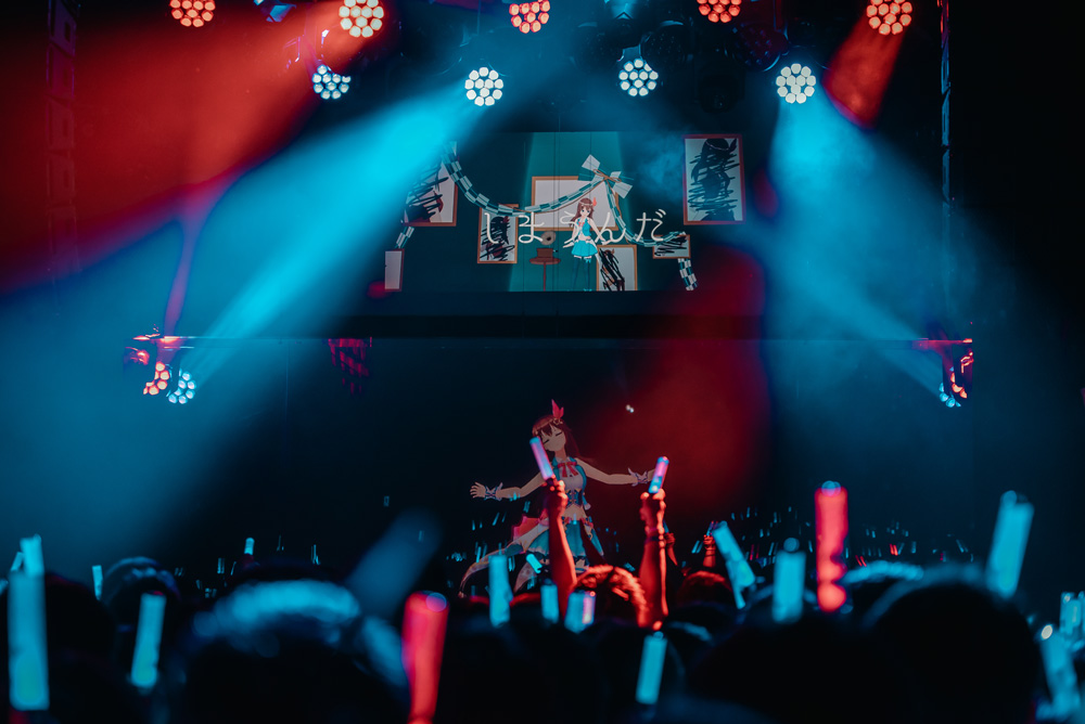 ロボ子さんのパフォーマンス終了後、ときのそらが登場。そらロボといえば、これまで様々な形で共演してきた。clusterの生放送や今年の5月に行われたIMAGINATION PARTYにもホロライブからときのそらとロボ子さんが出演するなど、何かと2人を見かけることは多い。そして今年の7月に投稿された「リモコン」のカバー曲は記憶に新しい。Veats Shibuyaの会場にリモコンのイントロが流れ始めた瞬間、会場の熱気が一気に上がったのがわかった。曲の中毒性に加え、ときのそらの高音とロボ子さんの低音の組み合わせがクセになるカバー曲だ。