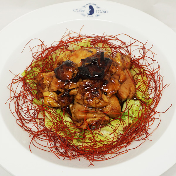 チキンの周りにはヘルズ・ファイア(地獄の業火)をイメージして糸唐辛子をトッピング。