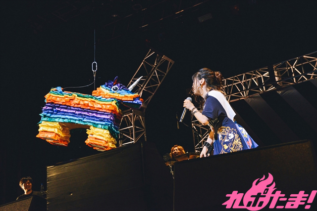 ひととおり楽しんだ後、次の曲へ、と思いきや、ここでバースデーケーキ……ではなく「ピニャータ」と呼ばれる、中にお菓子やおもちゃなどを詰めた人形が登場! アメリカやメキシコなど、おもに中南米で誕生日に催される企画で、亜咲花さんがおもちゃのバットを使って「ピニャータ割り」に挑戦! しかしバンドメンバーの力をかりてもなかなか割れず、みんなで苦笑い。