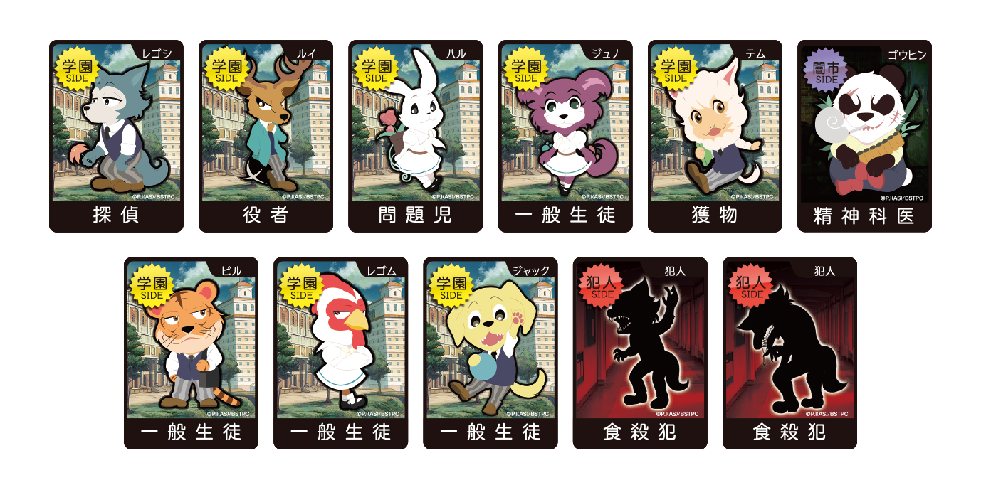 カードゲーム「ビースターズ×ワンナイト人狼」は、作品の世界観そのままに、チェリートン学園で起こった『食殺事件』の犯人を捜し出すゲームとなります。プレイヤーは、「学園サイド」に属するレゴシやルイといったキャラクターになりきり、「食殺犯サイド」に属する事件の犯人を捜し出します。