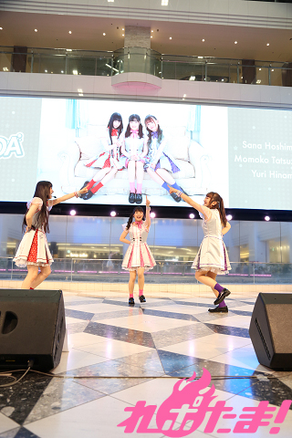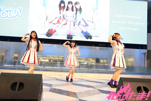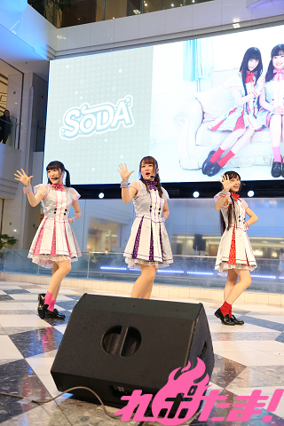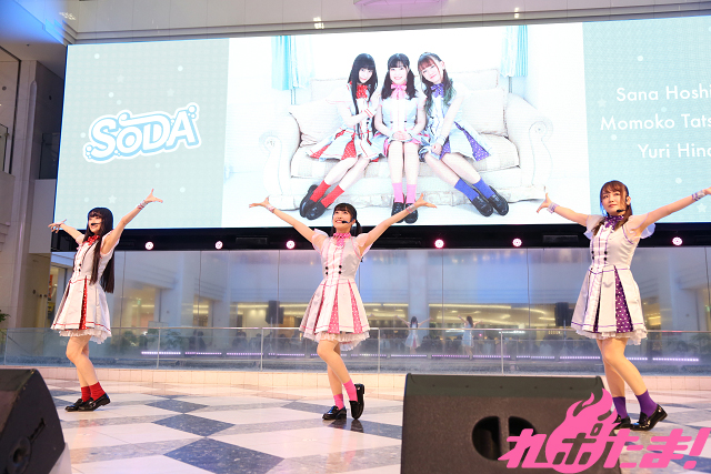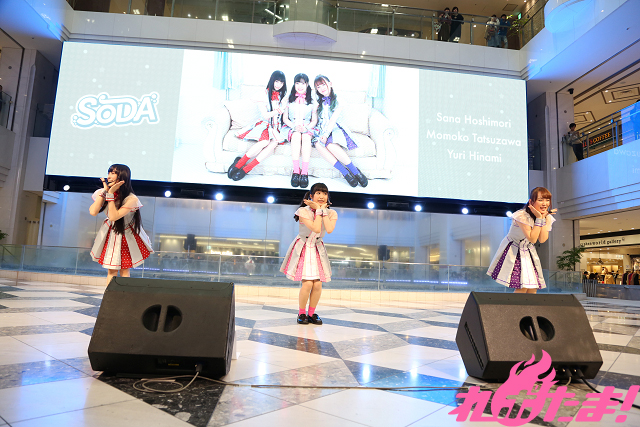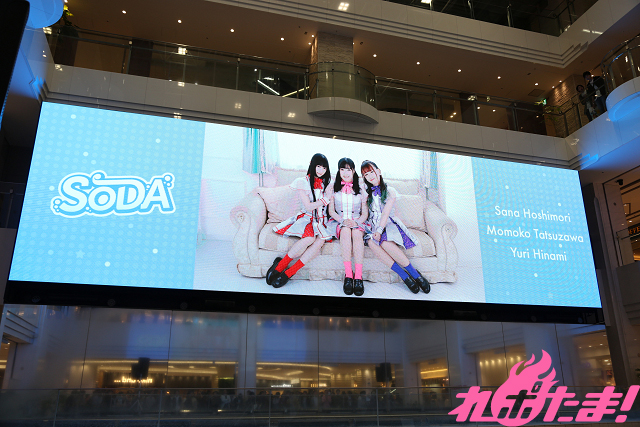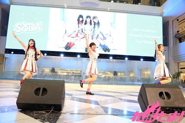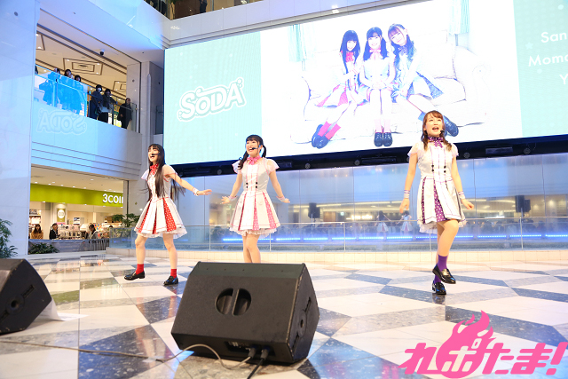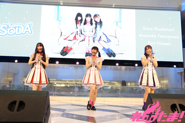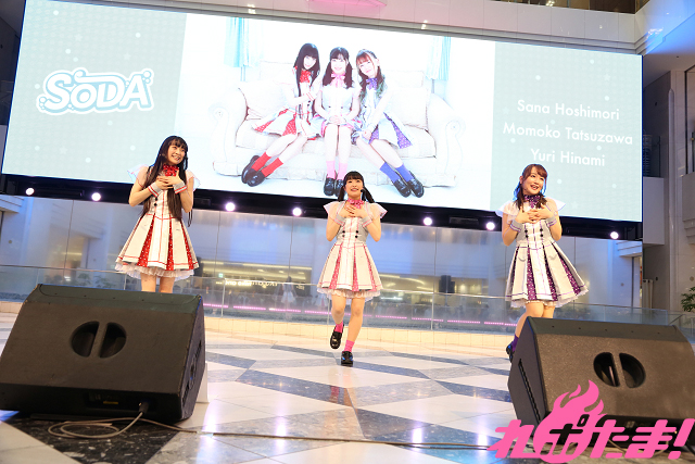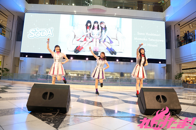 いま注目のスマホアプリゲーム『アイドルガールズ 栄光のプロデュース』から飛び出した星守紗凪/立沢萌々瑚/日南結里による3人組の声優ユニット・SODA。9月4日にデビューシングル「EARLY SUMMER LOVE」を発売し、10月28日には東京・池袋のサンシャイン噴水広場で最後のリリースイベントが開催された。