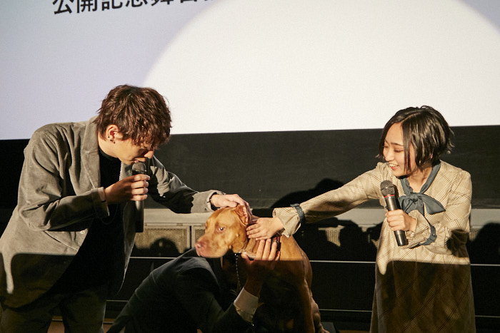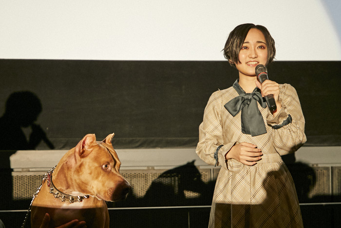 最後に、会場にいるお客さまとこれから作品を観る人へのメッセージを一言ずついただくと「心を打つ、良い気持ちになれる作品です。今日アメリカンピットブルテリアと会えて、作品から飛び出てきたように感じ、嬉しい気持ちになりました。会場にいる方も同じような気持ちになっていたらお友達やSNS などに映画おもしろかったよと広めていただけると嬉しいです。」とアメリカンピットブルテリアに会えた喜びとお客様への感謝の気持ちを述べると、