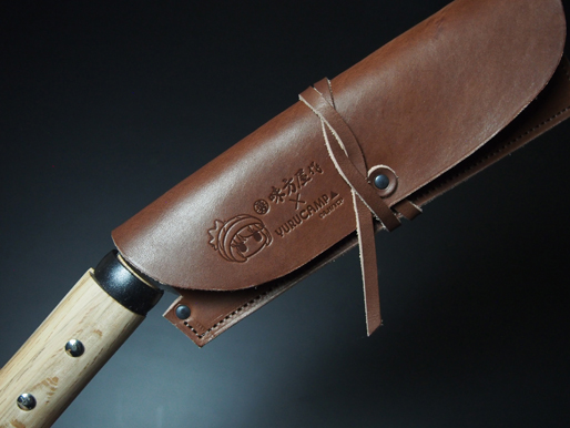 また今回のコラボ用に厚みのある栃木レザーを使用した特別仕様のレザーケースを開発。鉈入れとしては珍しい革ひもで包んで収納するロールタイプです。レザーケースにもリンちゃんのデフォルメ顔(ニットキャップver.)とコラボロゴの刻印を施しました。
