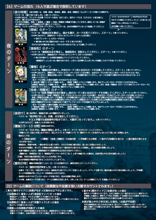 セット内容:村人(一般生徒)カード 4枚 / 人狼(食殺犯)カード 2枚 / 占い師(探偵)カード1枚 / 怪盗(役者)カード1枚 / 問題児カード 1枚 / 獲物カード1枚 / 精神科医カード1枚 /遊び方説明書