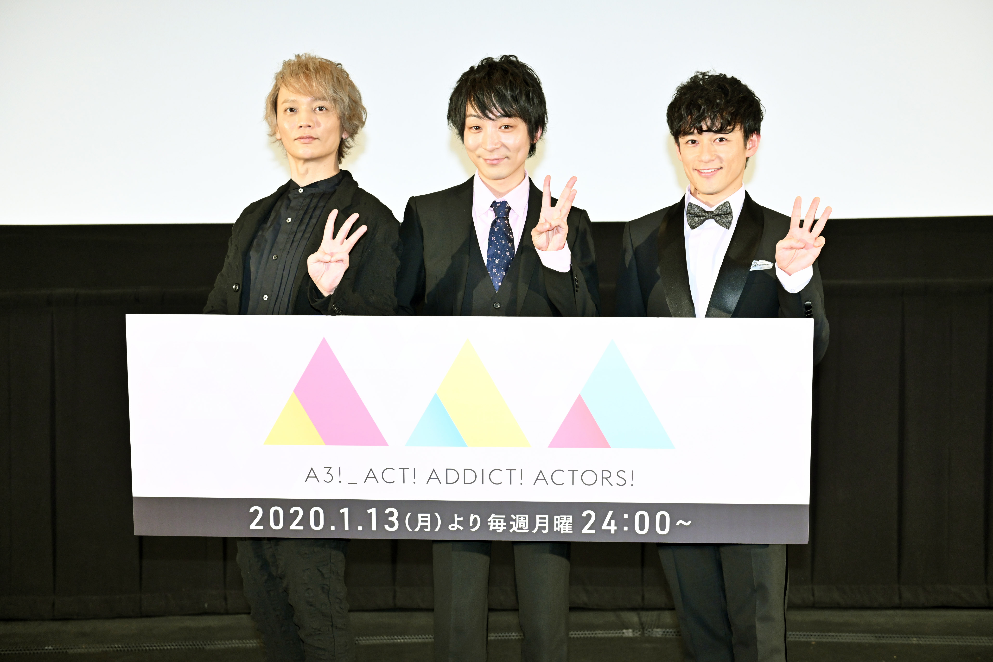 そして放送に先駆けて12月8日(日)に新宿バルト9にて先行上映会が開催された。『A3!』SEASON SPRINGの第1話・第2話が上映され、佐久間咲也役・酒井広大、茅ヶ崎至役・浅沼晋太郎、シトロン役・五十嵐雅が出演し、作品ついての見どころや本編にちなんだゲームコーナーなどで大いに盛り上がった。